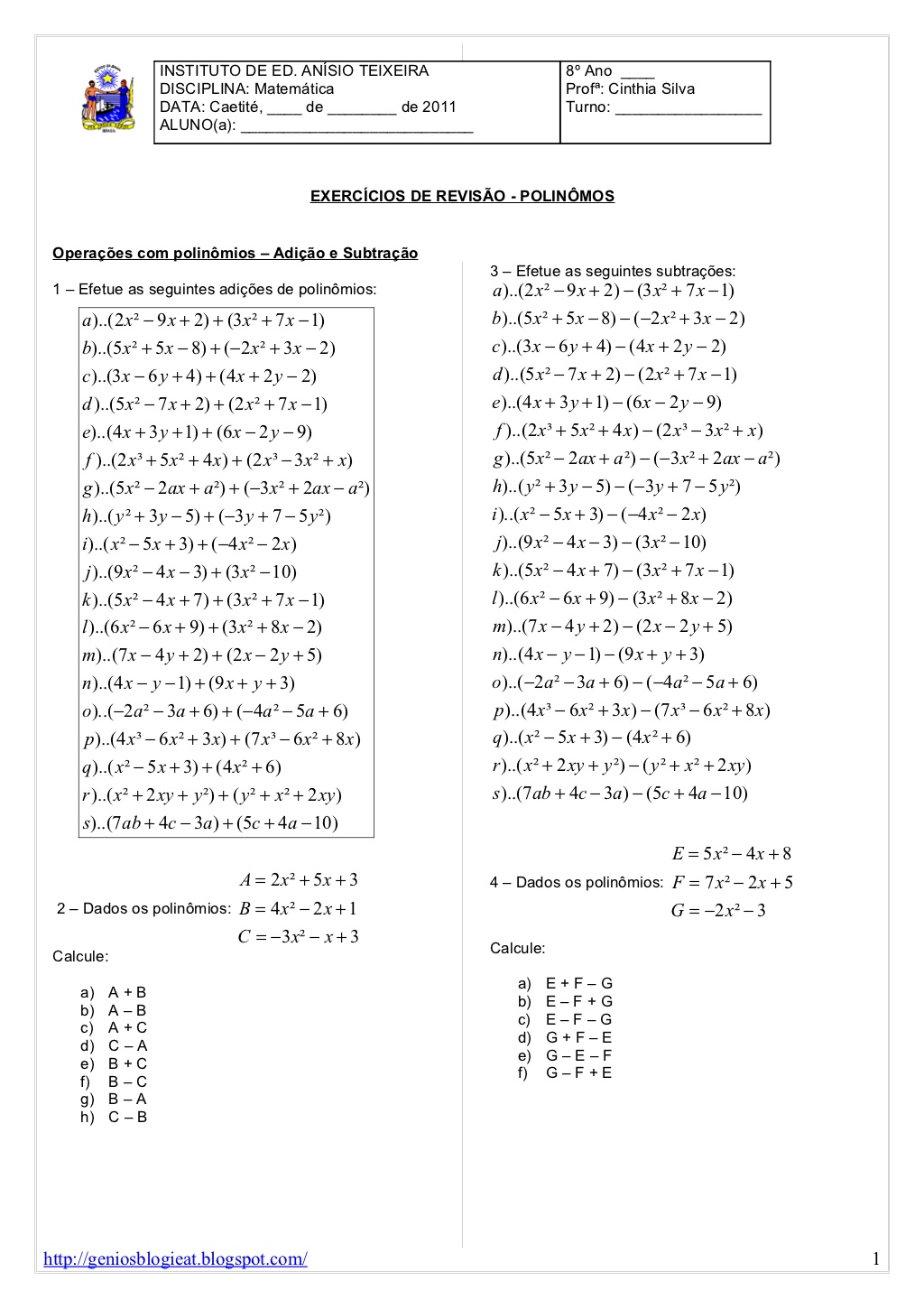 Atividade De Polinomios 8 Ano - REVOEDUCA